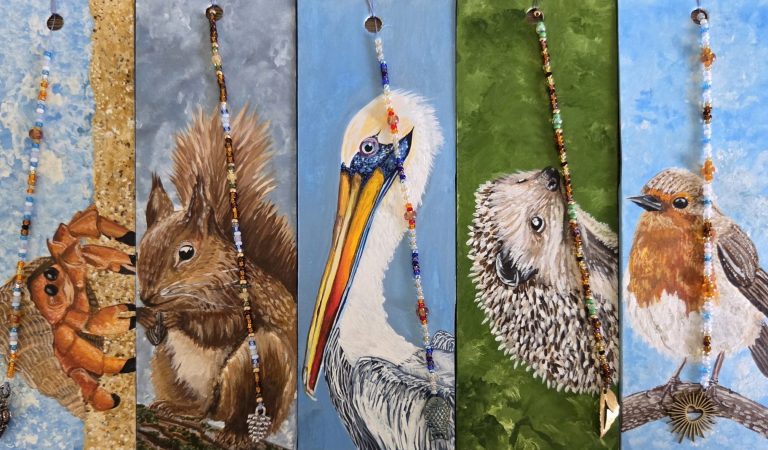 I hand paint and bead bookmarks of a variety of subjects, from celestial designs to your favorite flowers and animals. These are painted using gouache on art board resulting in a sturdy and hard wearing bookmark. They are sealed with a wax that when dry, provides protection for both the painting and your books.
